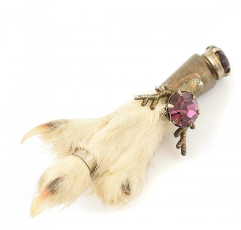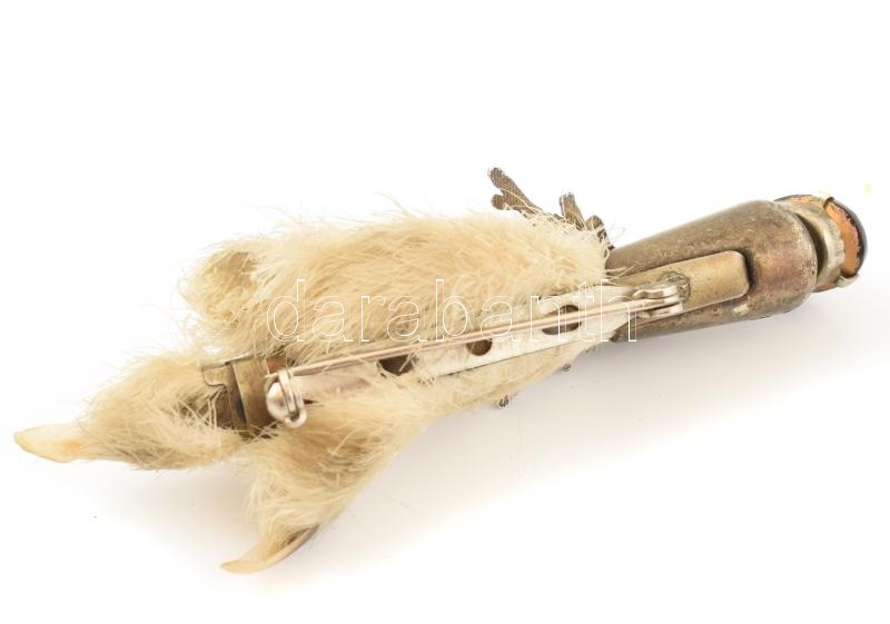 Madárlábból kialakított fém kitűző, 2 db lila köves díszítéssel, h: 8,...