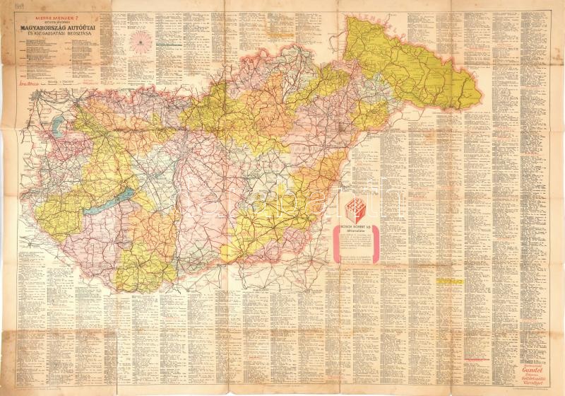 Description: 1939 Stoits György: Merre menjek?, Magyarország autóutai és közigazgatási beosztása térkép, 1: 750.000, korabeli reklámokkal, helységnévtárral, Bp. Gottlieb, szakadt, 62x94 cm