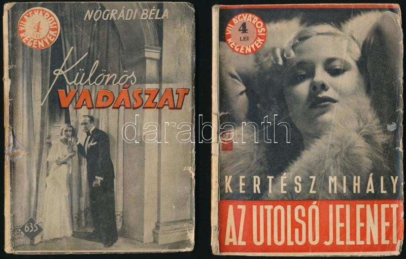 Description: 2 db régi ponyvaregény: Kertész Mihály: Az utolsó jelenet. Bp., 1933, Világvárosi Regények. Papírkötésben, sérült borítóval. Borítón 4 lei címkével. + Nógrádi Béla: Különös vadászat. Bp., 1939, Literaria. Papírkötésben, sérült borítóval. Borítón 4 lei címkével.