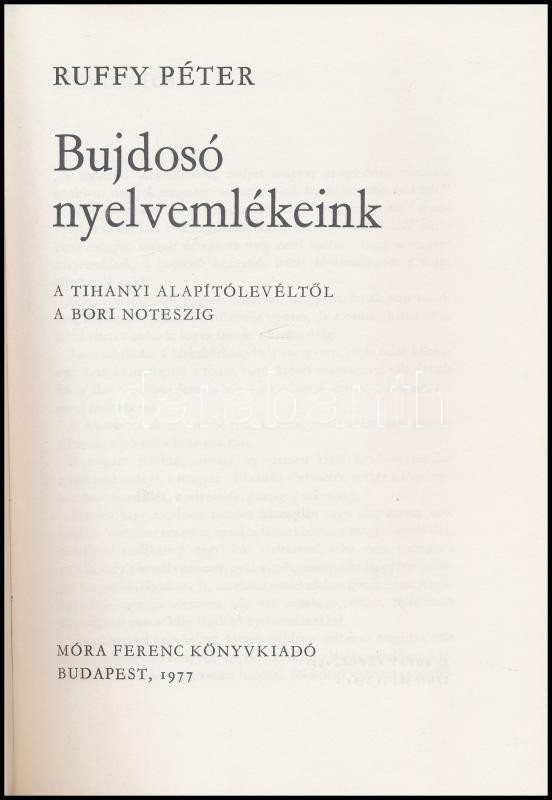 Ruffy Péter: Bujdosó nyelvemlékeink. A tihanyi alapítólevéltől a bori noteszig. Bp., 1977, Móra. Kiadói egészvászon-kötés, kiadói papír védőborítóban, benne cikkekkel, jó állapotban.