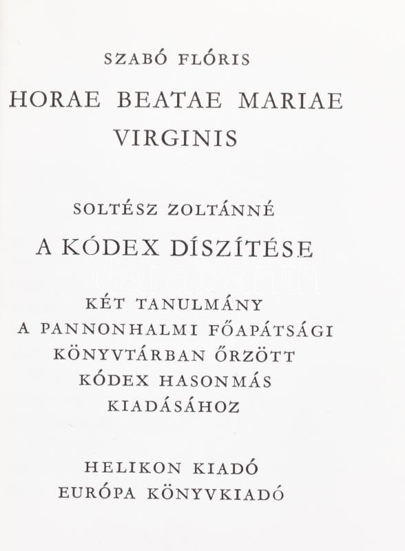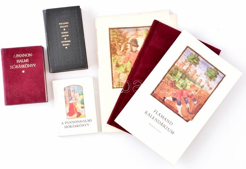 Vegyes könyv tétel, 3 db: Flamand kalendárium. Soltész Zoltánné: Flamand kalendárium c. kísérőtanulmányával. Bp., 1983, Helikon. Hasonmás kiadás. Kiadói aranyozott velúr-, és kiadói papírkötésben, kiadói kartontokban, jó állapotban.; A Pannonhalmi Hóráskönyv. A Pannonhalmi Főapátsági Könyvtárban őrzött kódex hasonmása. Bp., 1982, Európa - Helikon. Kísérőtanulmánnyal. Minikönyv. Kiadói kissé kopott aranyozott egészbársony-kötés, és kiadói papírkötés.; Balassa Bálint: Balassa Bálint és Rimai János istenes éneki. Bp., 1983, Helikon. Hasonmás kiadás. Minikönyv. Kiadói kissé kopott dombornyomott aranyozott egészbőr-kötésben.