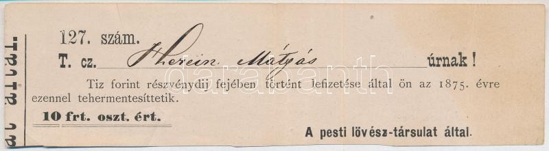 1875. "A pesti lövész-társulat" névre szóló éves tagsági jegye 10Ft értékben T:II két helyen vágott
