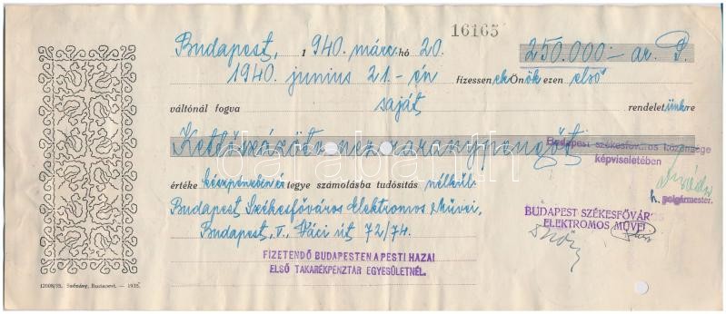 Budapest 1940. "Budapest Székesfőváros Elektromos Művei" váltó 250 aranypengőről okmánybélyegekkel, bélyegzésekkel, lyukasztásokkal érvénytelenítve T:III