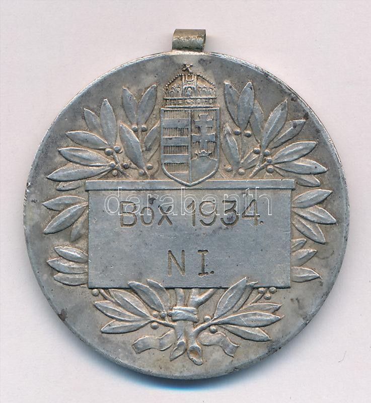 Description: Berán Lajos (1882-1943) 1934. "Magyar Királyi Államvasutak Sportegyesületének Ligája" Ag díjérem "HP" beütéssel, "Box 1934. N I." gravírozással, mellszalag és függesztőkarika nélkül (23,01g/37mm) T:2 kis ph. TP 278.