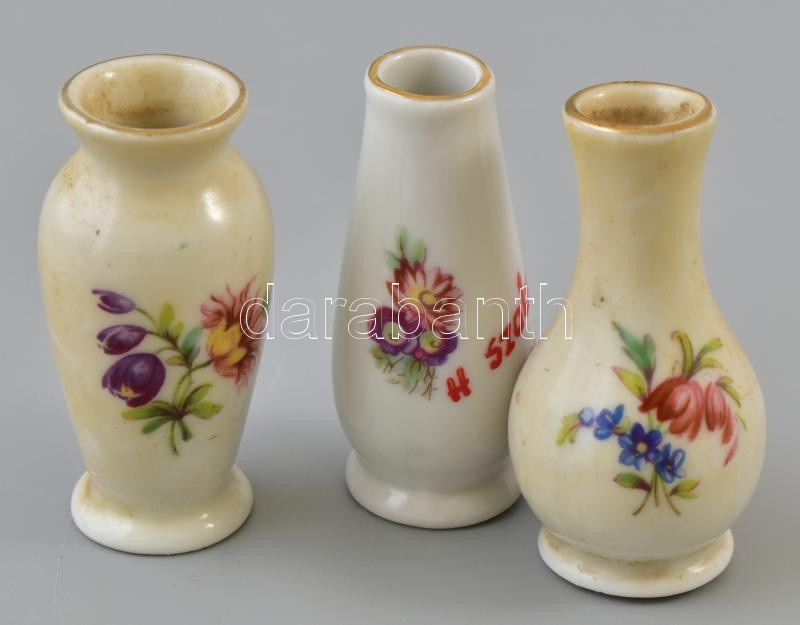 Hollóházi porcelán miniváza, 3 db, matricás, jelzett, kopott, foltos, ...