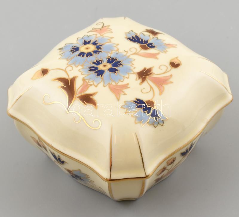 Zsolnay búzavirág mintás porcelán bonbonier, kézzel festett, jelzett, hibátlan. 9,5x9,5x6 cm