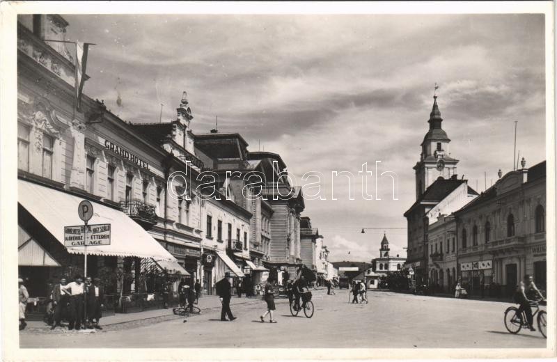 1931 Beregszász, Beregovo, Berehove; Verbőczy tér, templom, Nagy szálloda, kávéház, garage és étterem, Cikta, Willig., Hartmut vaskereskedés, gyógyszertár, üzletek, magyar zászló, kerékpárosok / square, shops, hotel, cafe and restaurant, pharmacy, Hungarian flag