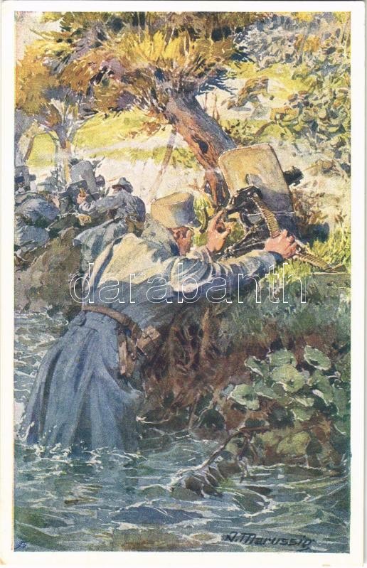 Description: 1916 Oberleutnant Georg Rimbas des 63. Infanterieregimentes stand hinter seinem Maschinengewehr durch fünf Stunden bis über die Knie in reißendem Wasser. Aus dem goldenen Buche der Armee Serie II. / WWI Austro-Hungarian K.u.K. military art postcard, soldier with machine gun. Offizielle Karte für Rotes Kreuz, Kriegsfürsorgeamt Kriegshilfsbüro Nr. 263. s: Marussig (EK)