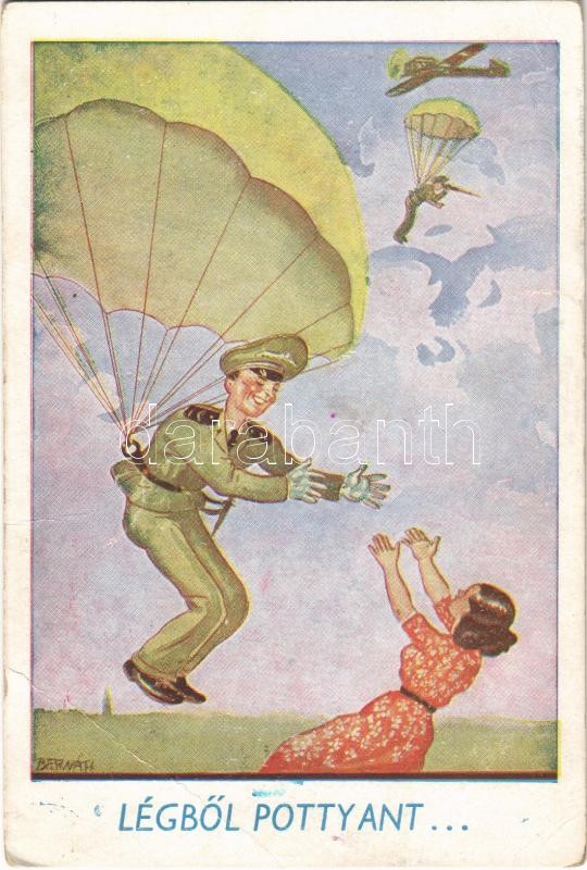 1944 Légből pottyant... / WWII Hungarian military humour art postcard, parashooter s: Bernáth (EB)