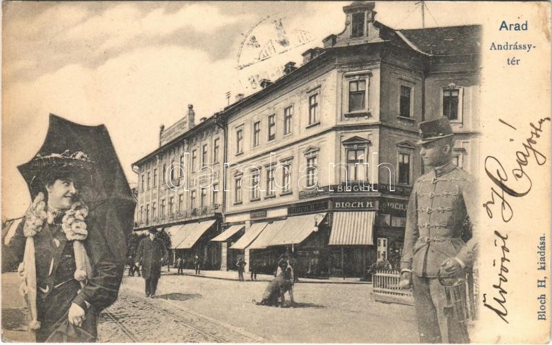 Description: 1904 Arad, Andrássy tér, Reinhart Fülöp üzlete, Bloch H. nyomdája és saját kiadása, montázs katonával és úri kisasszonnyal / square, shops. Montage with soldier and lady