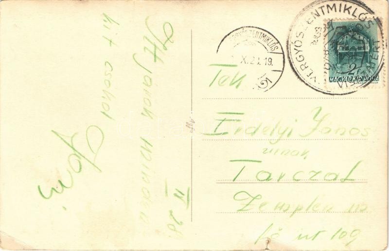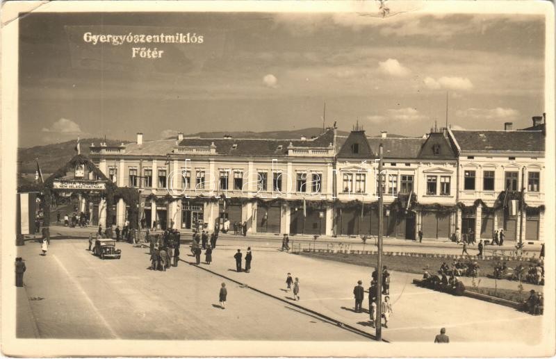 1940 Gyergyószentmiklós, Gheorgheni; Fő tér bevonuláskor, "Soha többé el nem választhatnak!" feliratos díszkapu, horogkeresztes zászlók, automobil / entry of the Hungarian troops, main square, Hungarian irredenta propaganda, decorated gate, swastika flags, automobile. photo + "1940 Gyergyószentmiklós visszatért" So. Stpl. (kis szakadás / small tear)