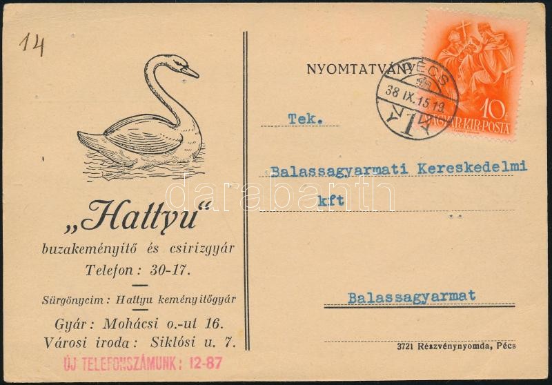 1938 "Hattyú" búzakeményítő és csirizgyár reklámos levelezőlapja, megí...