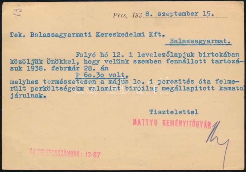 1938 "Hattyú" búzakeményítő és csirizgyár reklámos levelezőlapja, megírt és futott