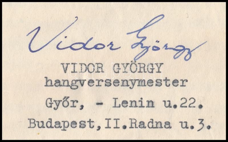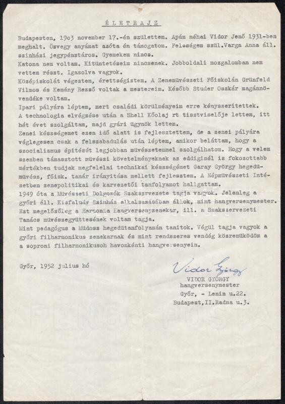 1952 Győr, Vidor György hangversenymester életrajza, aláírásával