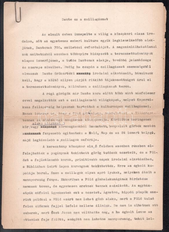 Ponori Thewrewk Aurél (1921-2014) csillagász gépelt értekezése "Dante ...