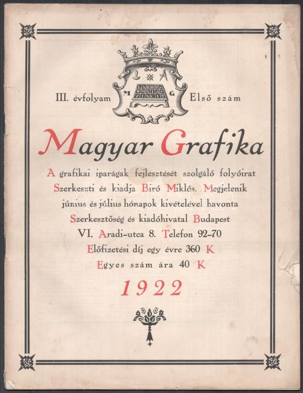 1922 Magyar Grafika III. évfolyamának 1. száma, elején lapszéli szakad...