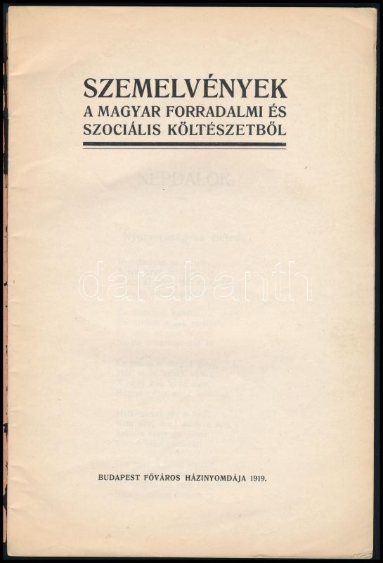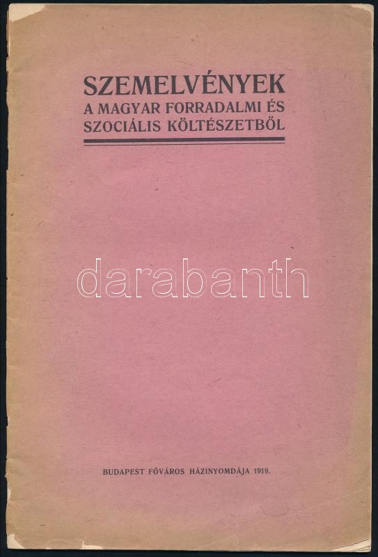 Szemelvények a magyar forradalmi és szociális költészetből. Bp., 1919,... https://www.darabanth.com/en/393-Online-auction/393.0/Books/Books-Other-rarities~1000027/Szemelvenyek-a-magyar-forradalmi-es-szocialis-kolteszetbol-Bp-1919-Budapest-Fovaros-Haz~II2383559