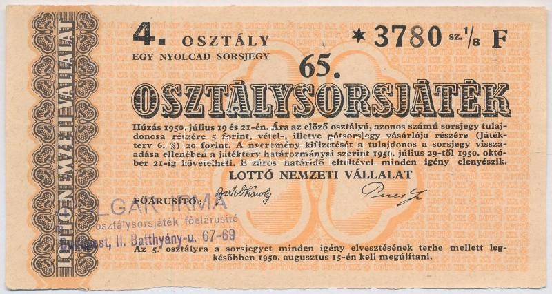 1950. "65. Osztálysorsjáték" 4. osztály 1/8 sorsjegy, "F" sorozat, felülbélyegzéssel T:I-
