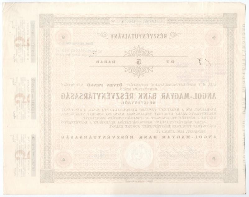 Budapest 1946. "Angol-Magyar Bank Részvénytársaság" részvényutalványa 5db részvényről egyenként 50P értékben, szárazpecséttel, szelvényekkel T:II
