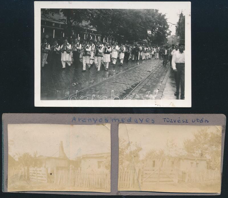 cca 1910 Aranyosmeggyes, házak tűzvész után, 2 db fotó, kartonra ragasztva, egyik sérült, 4×6 cm + 1964 Temesvár, felvonulás, fotó, 6,5×9,5 cm