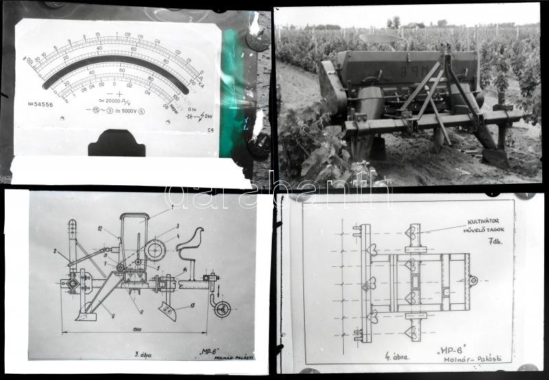 Description: cca 1960 Csongrád-Bokros, a helyi TSZ-ben fejlesztett szőlőművelő gép bemutása a terepen (6 db vintage NEGATÍV) és a műszaki rajzokon (17 db negatív), Hajdu János (?-?) csongrádi fényképész hagyatékából, 6x9 cm és 10x15 cm között