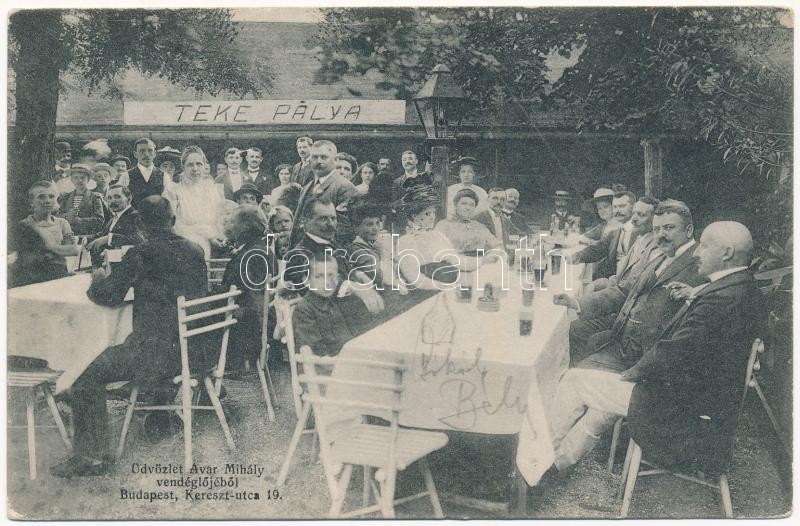 Budapest I. Avar Mihály vendéglője, étterem, kert pincérekkel és vendégekkel, hátul tekepálya. Kereszt utca 19. (Rb)