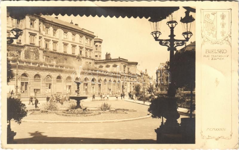 1934 Bielsko, Bielsko-Biala; Plac Teatralny i Zamek / square, castle, coat of arms (EK)
