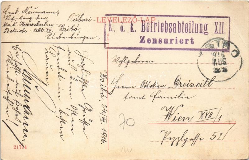 1916 Zsibó, Jibou; Sajovics és Komornik épületfa és deszka raktára, Vasútállomás, vonat, gőzmozdony / wood and plank warehouse, railway station, train, locomotive + "K.u.K. Betriebsabteilung XII" (EB)