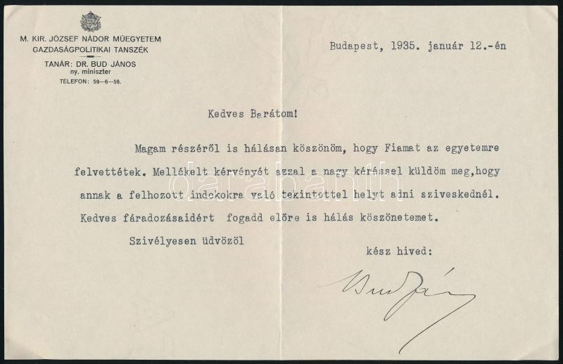 1935 Dr. Bud János (1880-1950), a Bethlen-kormány miniszterének aláírt levele, a M. Kir. József Nádor Műegyetem fejléces levélpapírján