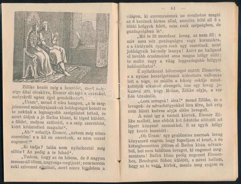 Description: [Medve Imre]: Bendeguz magyar vezér fiának Elemérnek, Attila öcscsének és az ő kedvese Zillikének története. Bp., 1896, Rózsa Kálmán és neje, 70 p. Szövegközti képanyaggal gazdagon illusztrált. Kiadói papírkötés.