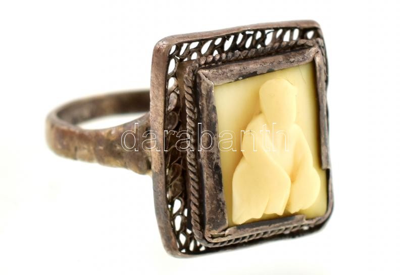 Description: Ezüst(Ag) gyűrű 1937 előtti magyar fémjellel. A pecsét rész kínai figurát ábrázol, faragott csontból, a faragvány ezüst pereme sérült, m: 54, bruttó: 4 gr