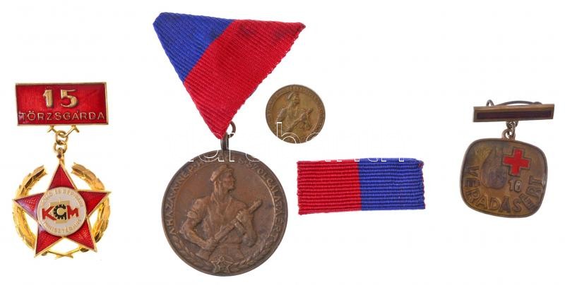 ~1960-1970. "Munkásőr" Br kitüntetés, szalagon, miniatűrrel szalagsávon, eredeti tokban + "Kohó és Gépipari Minisztérium - 15 év Törzsgárda " aranyozott és zománcozott jelvény műanyag tokban + "Véradásért 10" zománcozott Br jelvény sérült tokban T:1-,2