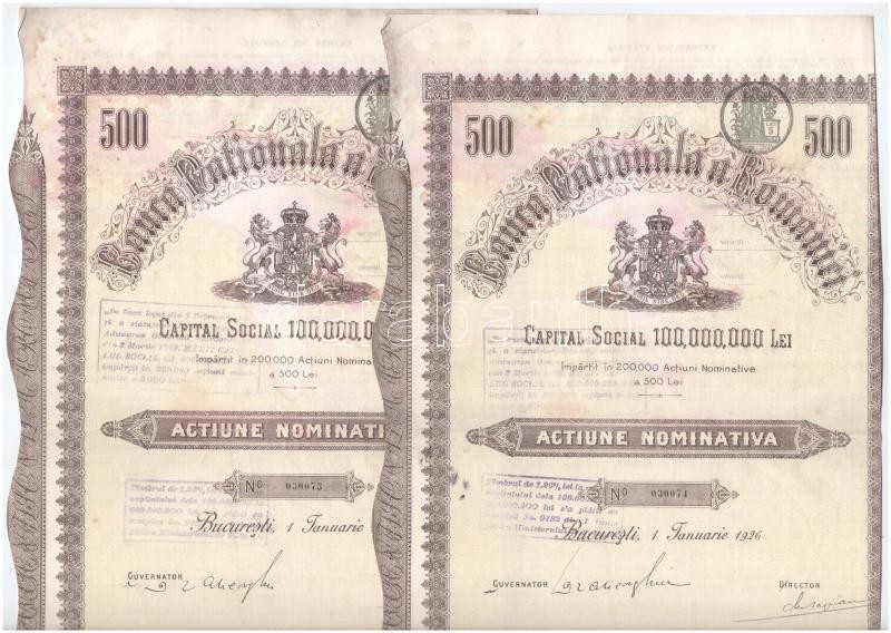 Description: Románia 1926. "Román Nemzeti Bank" részvénye 500L-ről (2x) sorszámkövetők, egyik szelvényekkel, felülbélyegzésekkel T:III