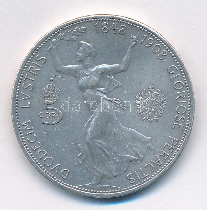 https://www.darabanth.com/en/394-Online-auction/394.0/Numismatics/Worldwide-silver-and-metal-coins~2000014/Ausztria-1908-5K-Ag-Ferenc-Jozsef-Jubileum-T2-ph-Austria-1908-5-Corona-Ag-Franz-Joseph-~II2392684