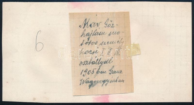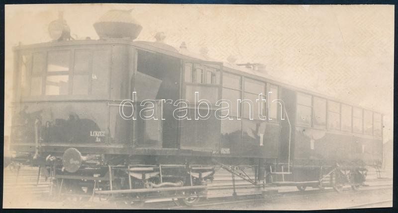 1905 Ganz Waggongyár, MÁV gőzhajtású motoros személykocsi, hátoldalon feliratozott fotó, 7×13,5 cm