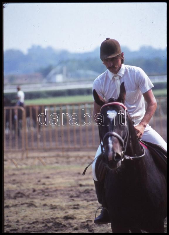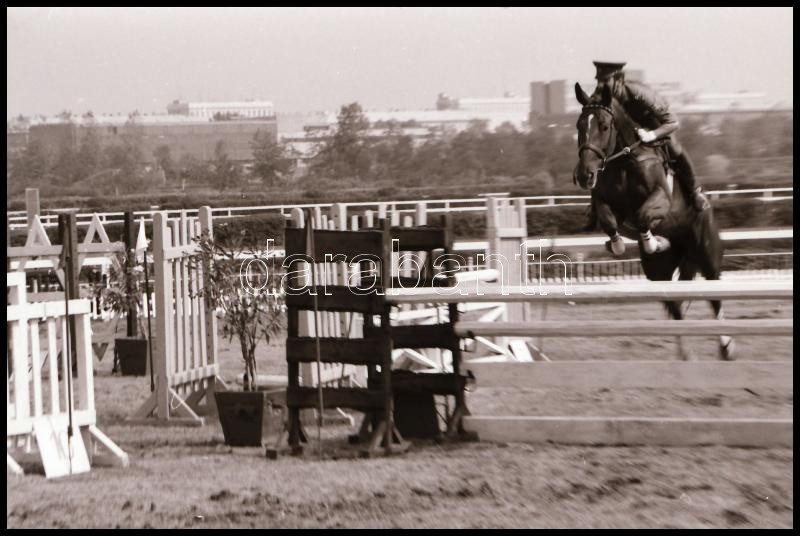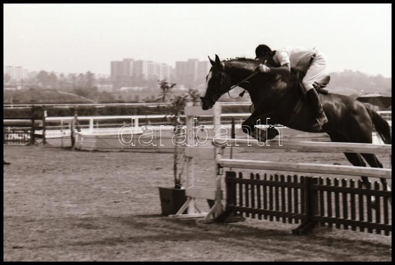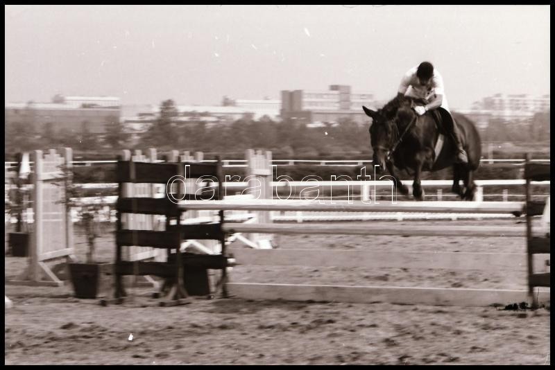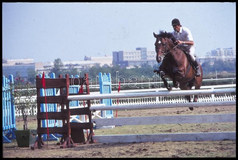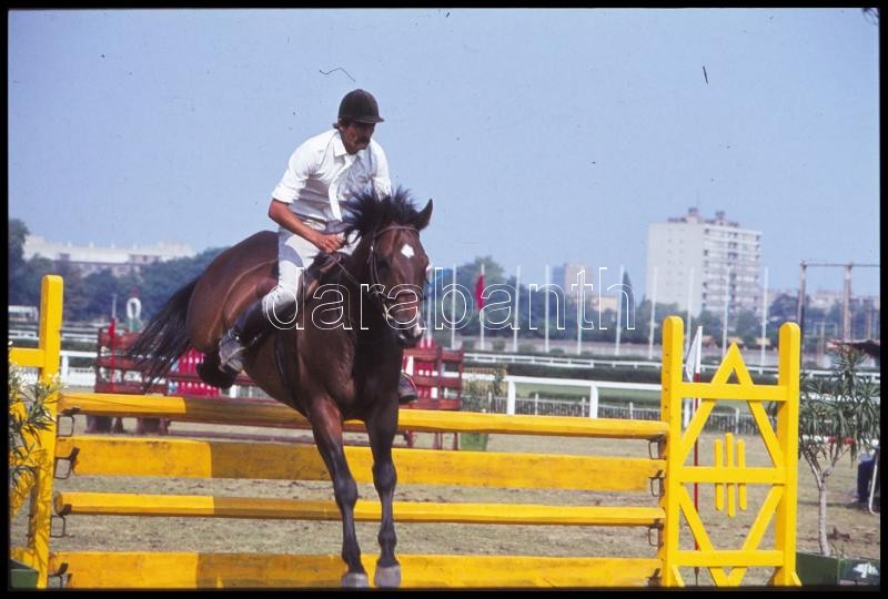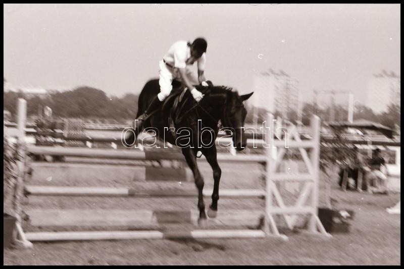 Description: cca 1980-as évek, Magyar Alfréd budapesti fotóművész lovakról, lovasokról, akadálypályán ugrásokról készített felvételei, 25 db vintage NEGATÍV + 9 db vintage DIAPOZITÍV felvétel, 24x36 mm