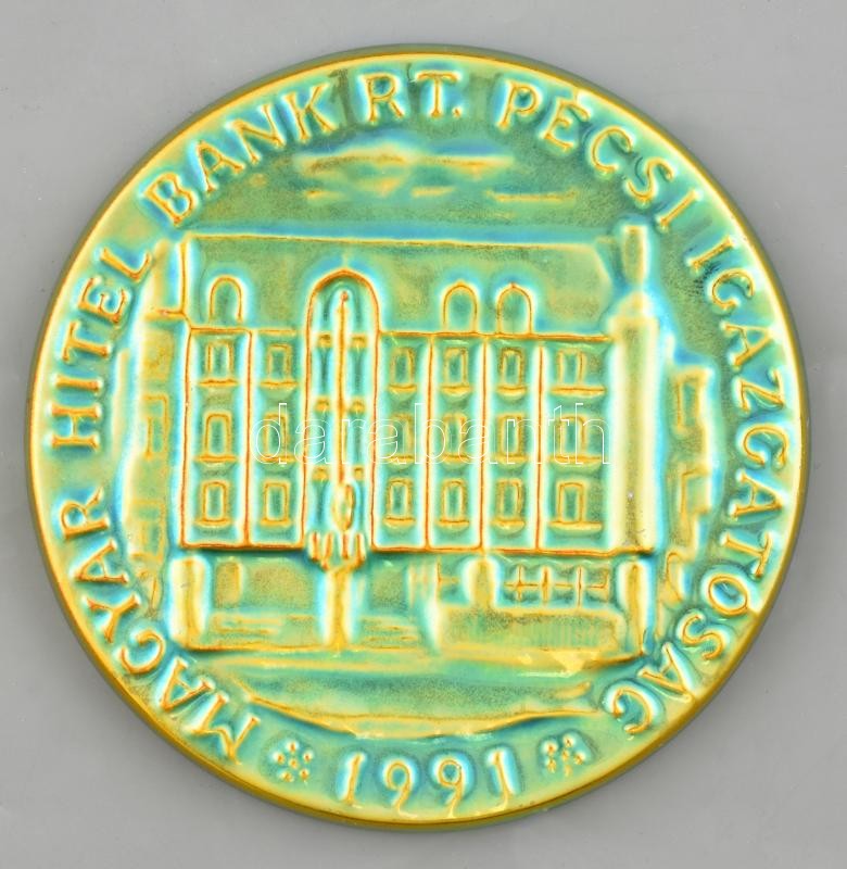 Zsolnay eozin mázas porcelán plakett Magyar Hitelbank Rt. pécsi igazga...