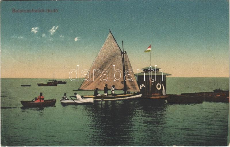 Balatonalmádi-fürdő, fürdőkabin magyar zászlóval, csónakok (ragasztóny...