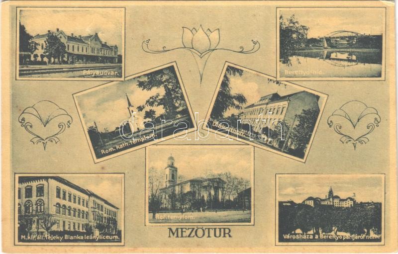 Mezőtúr, vasútállomás, római katolikus és református templom, diákotthon, Berettyó híd, Teleky Blanka leánylíceum. Borbély Gyula kiadása