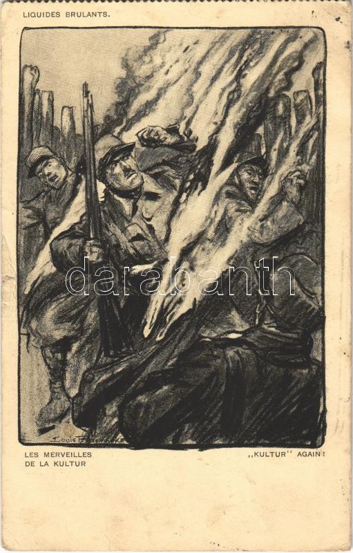 1917 Liquides Brulants. Les Merveilles de la Kultur / WWI French military art postcard (szakadás / tear)