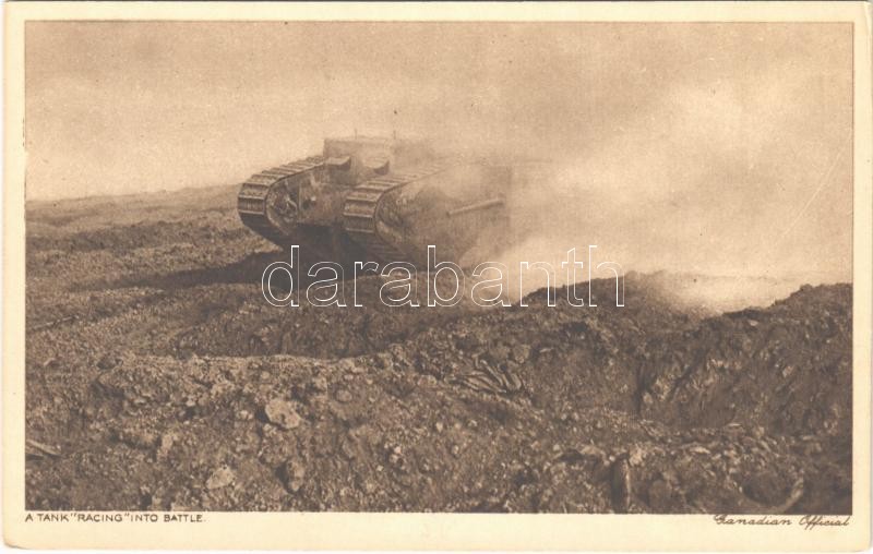 A tank racing into battle, Canadian official / WWI British military, tank