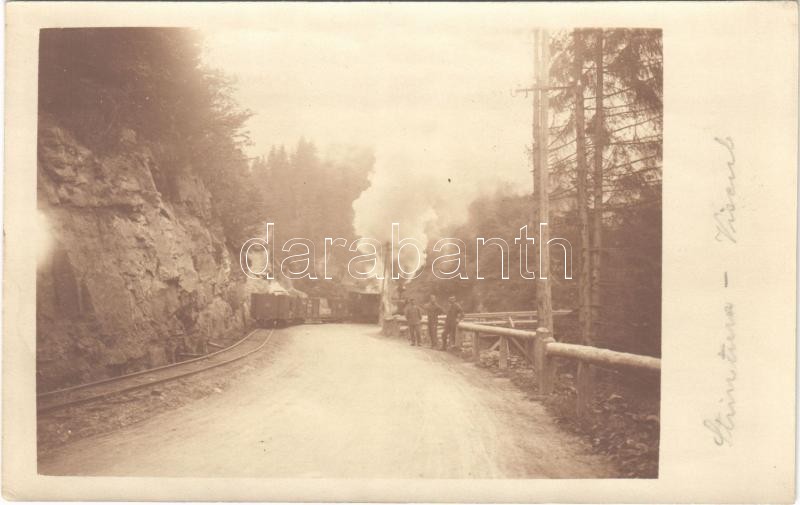 Description: Első világháborús osztrák-magyar gőzmozdony (Strintura-Viseul) a Borsa-Priszlop-Jakobeny keskeny nyomtávolságú gőzüzemű tábori vasútvonalon az erdélyi hegyekben. Prislopbahn gőzmozdony és katonák / WWI K.u.K. military railway of the Borsa-Prislop-Iacobeni narrow gauge steam powered field railroad in the Transylvanian mountains, soldiers and locomotive. photo