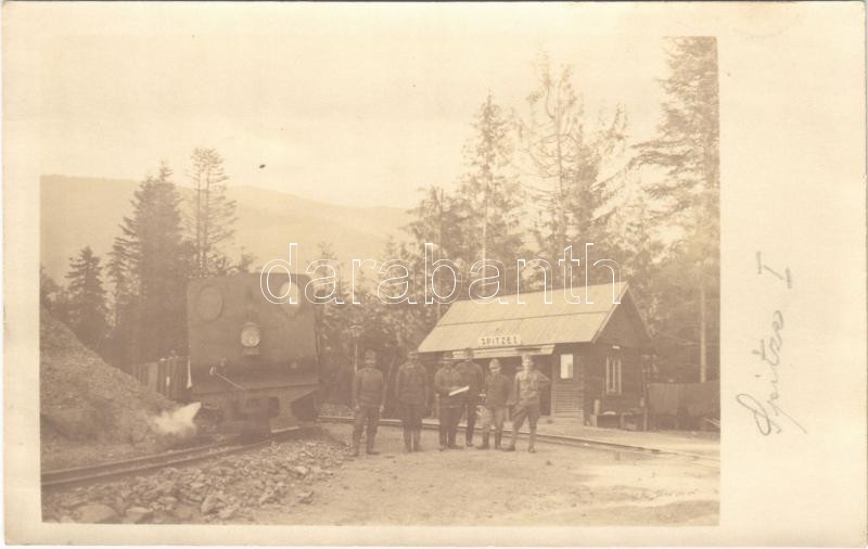 Description: Első világháborús osztrák-magyar vasútállomás (Spitze I.) a Borsa-Priszlop-Jakobeny keskeny nyomtávolságú gőzüzemű tábori vasútvonalon az erdélyi hegyekben. Prislopbahn gőzmozdony és katonák / WWI K.u.K. military railway station of the Borsa-Prislop-Iacobeni narrow gauge steam powered field railroad in the Transylvanian mountains, soldiers and locomotive. photo