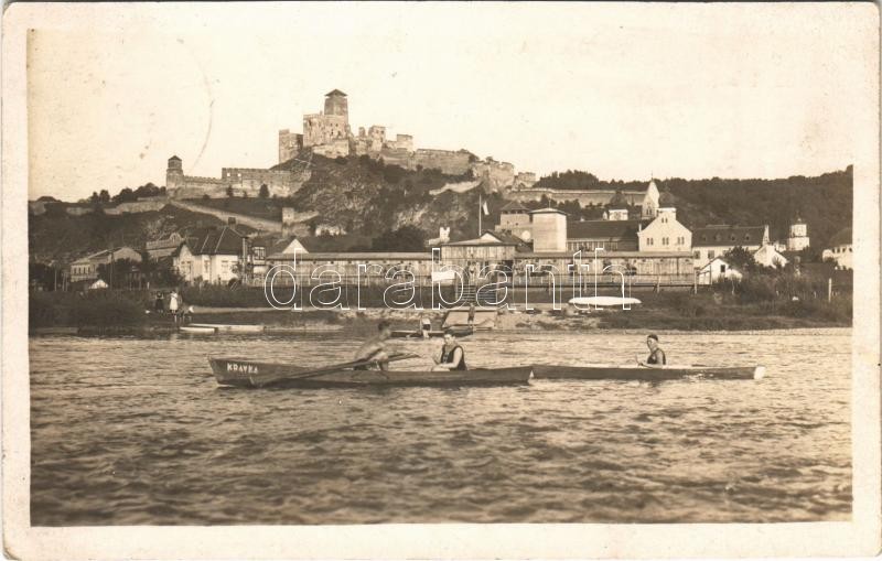 1927 Trencsén, Trencín; várrom, evezősök, zsinagóga / Trenciansky hrad / castle ruins, sport, rowing boats, synagogue. Foto Tatra (fl)