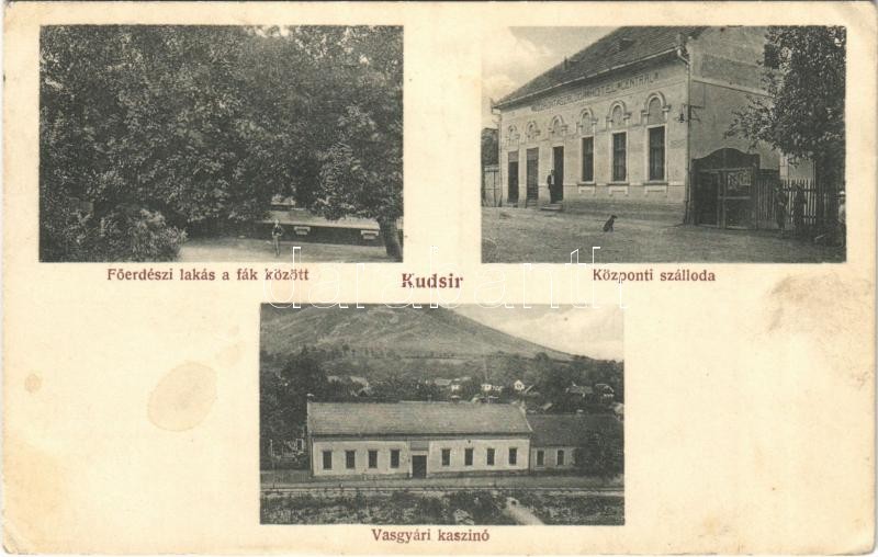 Description: 1918 Kudzsir, Kudsir, Cugir; Főerdészi lakás a fák között, Központi szálloda, vasgyári kaszinó. Czelnai Gyula felvétele, Gyöngyösy Gyula kiadása / forestry house, hotel, iron work's casino (EK)
