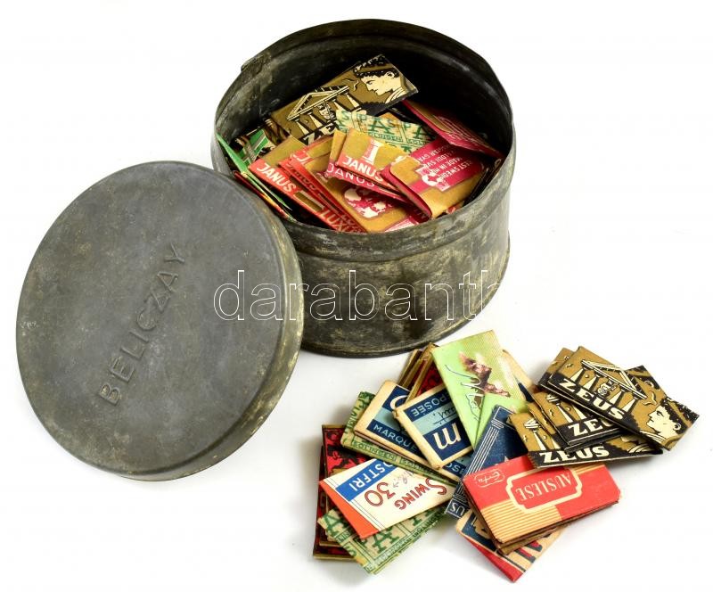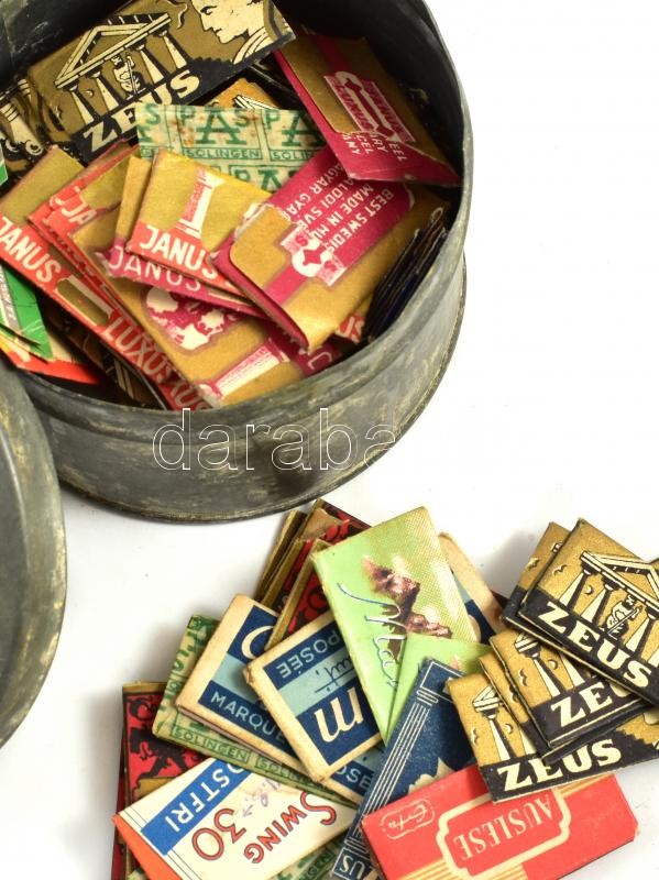 Régi, bontatlan borotvacímkék jelzett fém dobozban. d: 10 cm, m 6,5 cm