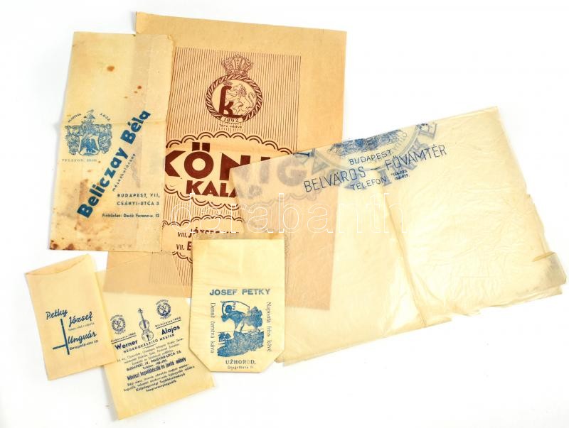 cca 1930-40 össz. 6 db reklámos, illusztrált papír tasak és csomagolóanyag: Petky József fűszer, ital, cukorka, Ungvár; Josef Petky, Uzhorod (Ungvár); Nagy Imre cs. és kir. udvari szállító, Bp.; Werner Alajos hegedűkészító mester, Bp.; König kalap, Bp., Beliczay Béla mézeskalácsos, Bp.; részben foltos és sérült