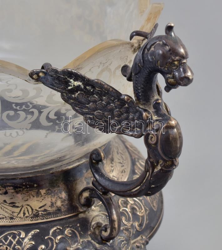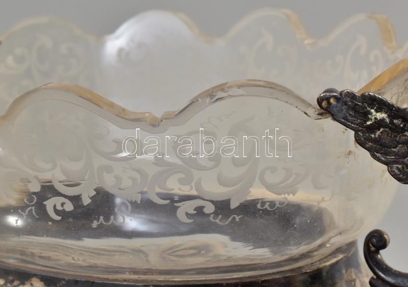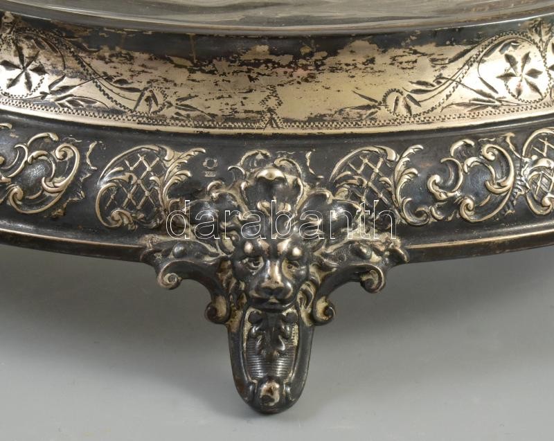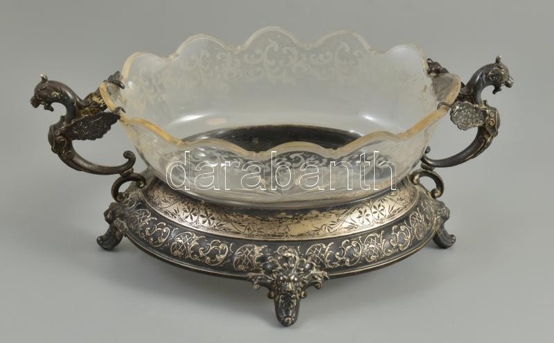 Sárkányfüles kínáló. Ezüstözött alpakka, csiszolt üveg betéttel. (Kis lepattanásokkal) XIX: sz. 33x18 cm