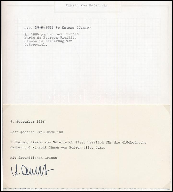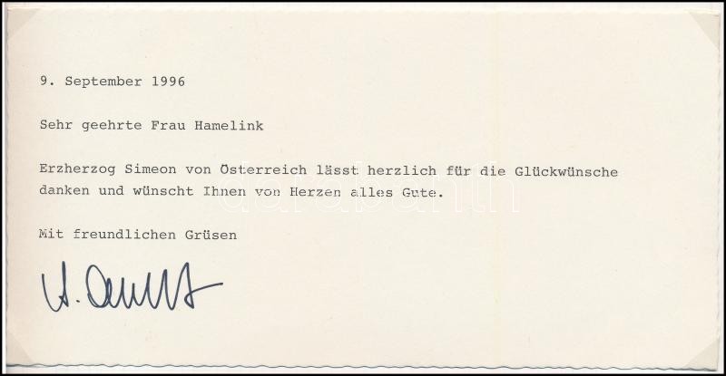 1996 Simeon von Habsburg-Lothringen (1958-) főherceg autográf aláírása... https://www.darabanth.com/en/395-Online-auction/395.0/Art-and-other-collectibles/Autographs~500020/1996-Simeon-von-Habsburg-Lothringen-1958-foherceg-autograf-alairasa-egy-udvozlo-lapon-La~II2374104