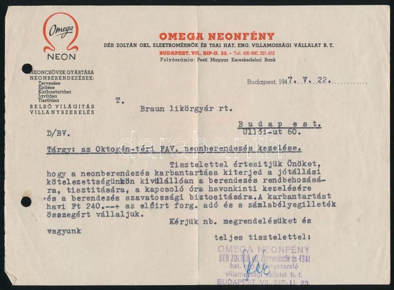 1947 Omega Neonfény vállalat fejléces levele, a Braun Likőrgyár Oktogon téri neonberendezésének karbantartási költsége tárgyában